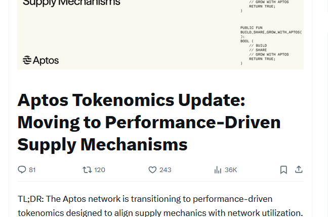 “The Aptos network is transitioning to performance-driven tokenomics designed to align supply mechanics with network utilization,” the Aptos Foundation said, adding:
