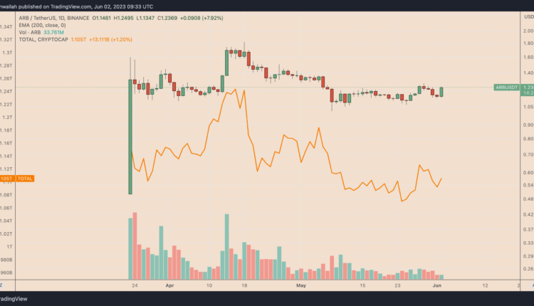 The price of Arbitrum (ARB) rose 9% to an intraday high of $1.25, beating the crypto market’s total overall gains of 1.5% in the same period.
