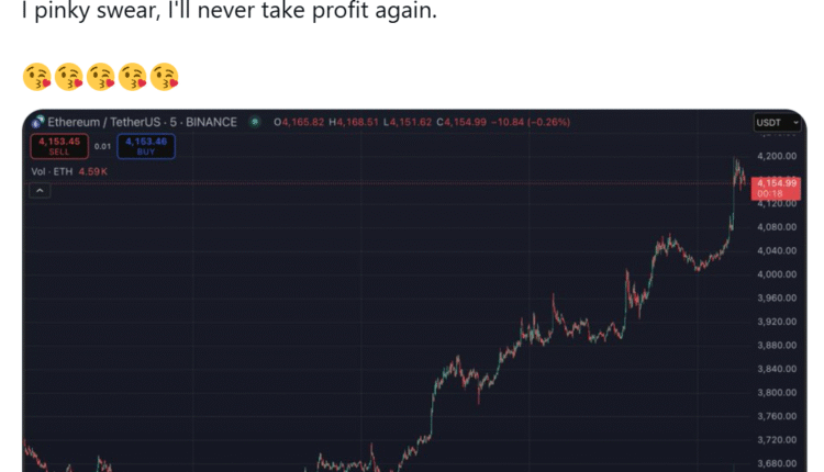 “Had to buy it all back, do you forgive me @fundstrat?” he wrote on X, tagging Tom Lee, the co-founder and head of research at FS Insight by Fundstrat. “I pinky swear, I’ll never take profit again,” he added.