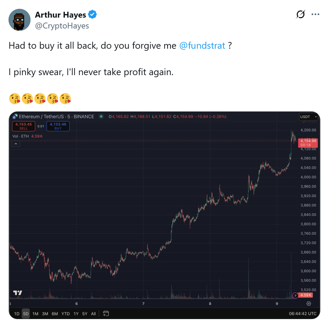 BitMEX co-founder and Bitcoin billionaire Arthur Hayes has bought back into Ethereum just a week after selling a large tranche.