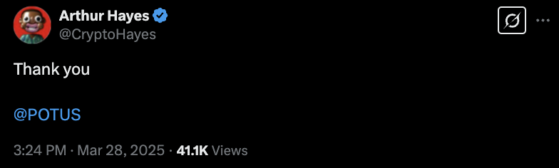 In March, Trump pardoned four former BitMEX executives, including Hayes, Benjamin Delo, Gregory Dwyer and Samuel Reed, who had pleaded guilty to Bank Secrecy Act violations tied to weak Anti-Money Laundering controls at the exchange.