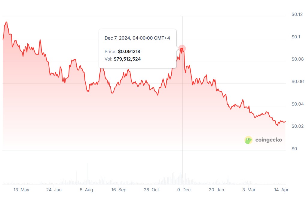 In December 2024, the token rallied along with the rest of the market, hitting a high of $0.09. Since then, the crypto asset had continuously dropped in value before hitting the new all-time low.