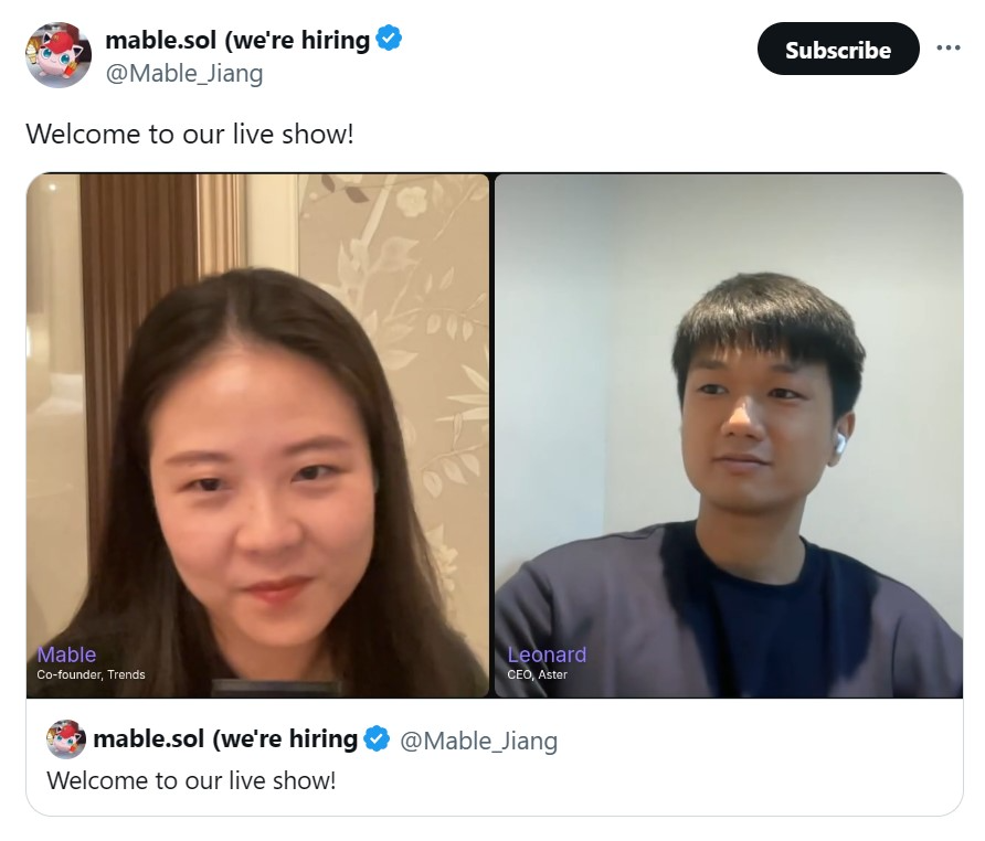 In the livestream, Aster’s Leonard said the team was still working on the distribution method for the upcoming airdrop.