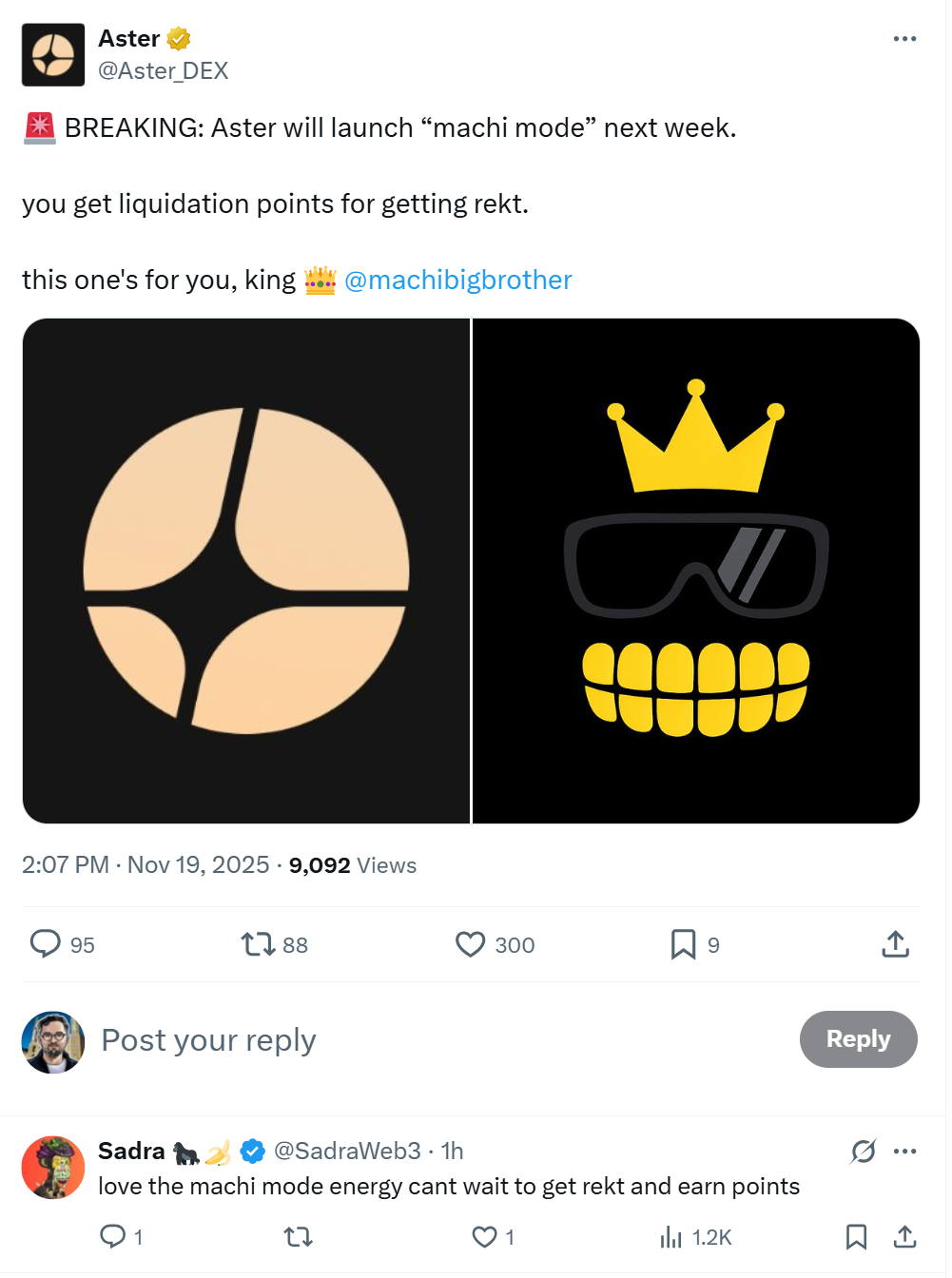 “You get liquidation points for getting rekt,” Aster wrote in a Wednesday post on X, adding that “this one’s for you, king @machibigbrother.”