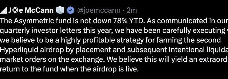 Shortly after, McCann took to X to defend the fund, writing that it was “not down 78%,” attributing the performance to a farm strategy tied to the “second Hyperliquid airdrop,” which he believes “will yield an extraordinary return to the fund when the airdrop is live.”