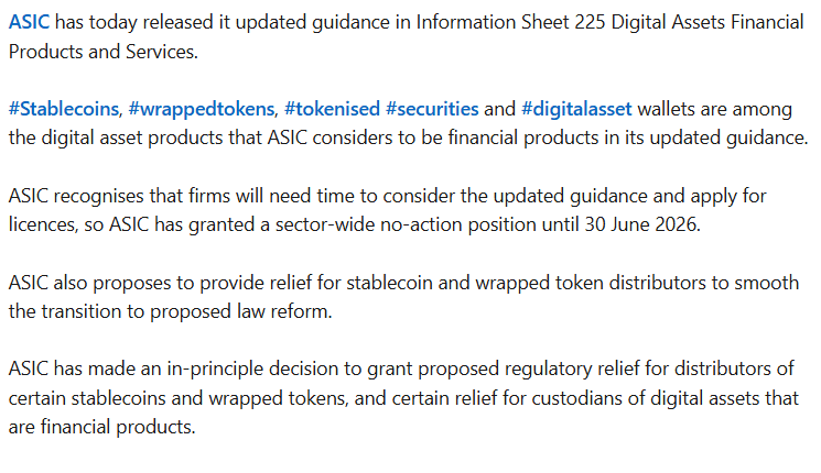 ASIC also said it has made an in-principle decision to grant regulatory relief for stablecoin and some wrapped token distributors to smooth the transition to proposed law reform.