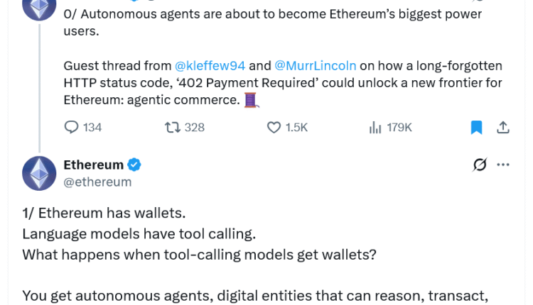 The pair said autonomous agents could become Ethereum’s “biggest power user” in the X post. Coinbase has already implemented HTTP 402 via the “x402 payments protocol,” according to its GitHub account.
