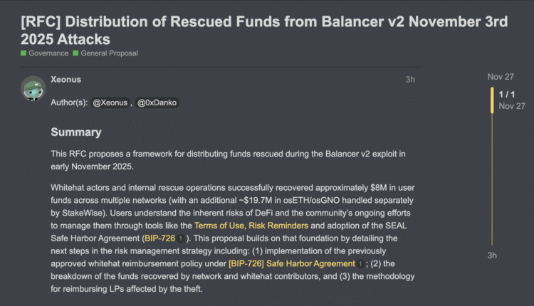 Two members of the Balancer protocol community submitted a proposal on Thursday outlining a distribution plan for a portion of the funds recovered from the protocol’s $116 million November exploit.