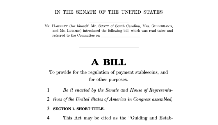 The GENIUS stablecoin bill was introduced by Senator Bill Hagerty on Feb. 4 as a comprehensive regulatory framework for tokenized US dollars.
