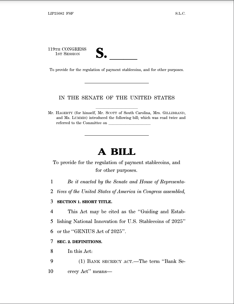 Page one of the GENIUS Act of 2025. Source: US Senate