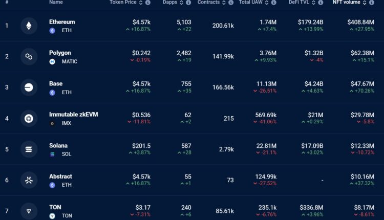Decentralized application data aggregator DappRadar showed that Base’s NFT volume reached $47.67 million, increasing by 70% over the past month. The increase pushed the network ahead of many competitors in the NFT space, including Immutable zkEVM and Solana, which are ranked fourth and fifth by 30-day volume.