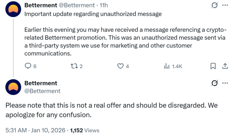Betterment has warned users to disregard a crypto promotion message that circulated on Friday, describing it as an unauthorized notification that was sent through a third-party system.