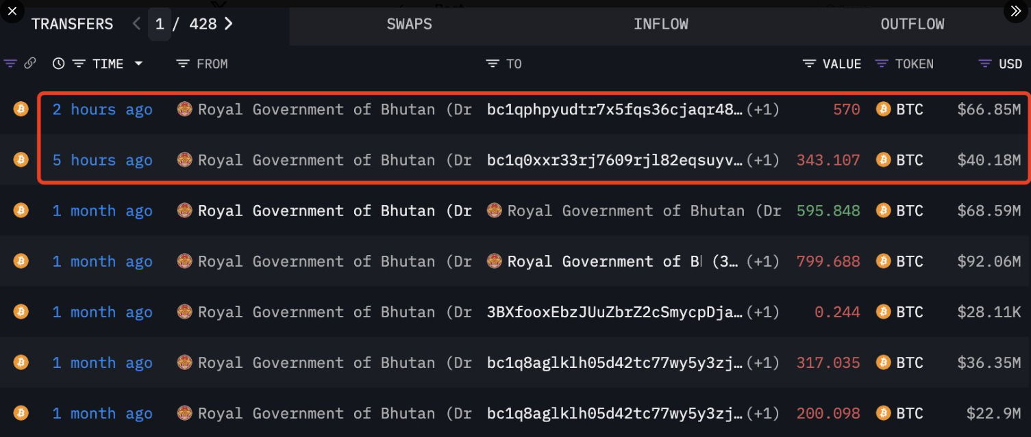 The Bhutan transfers came as other large holders moved coins ahead of potential volatility.