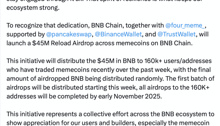 BNB Chain has launched a $45 million “reload airdrop” aimed at compensating users who suffered losses trading memecoins during Friday’s market crash.