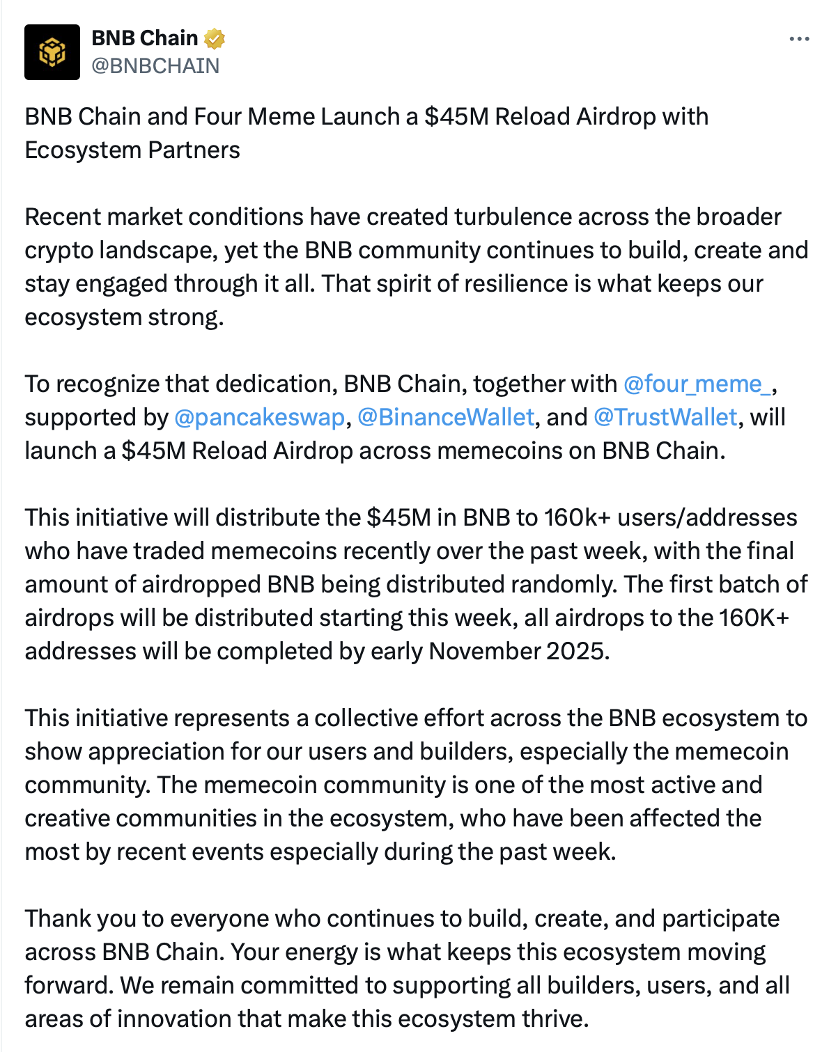 According to Binance’s founder and former CEO Changpeng Zhao, rewards will be allocated randomly. Ecosystem partners such as Four Meme, PancakeSwap, Binance Wallet and Trust Wallet will help distribute the funds to eligible traders.