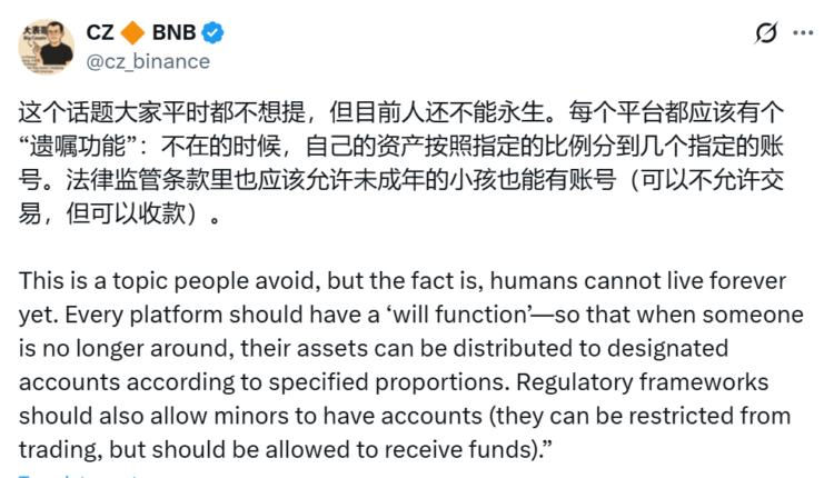 “This is a topic people avoid, but the fact is, humans cannot live forever,” CZ wrote on X. “Every platform should have a ‘will function’ so that when someone is no longer around, their assets can be distributed to designated accounts according to specified proportions,” he said.