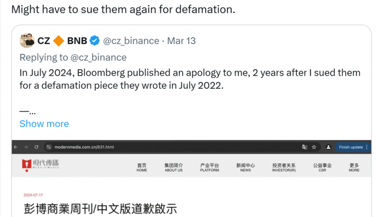 Zhao’s tweet referenced a previous legal dispute with Bloomberg, linking to a July 2024 apology from the publication’s Chinese-language edition.