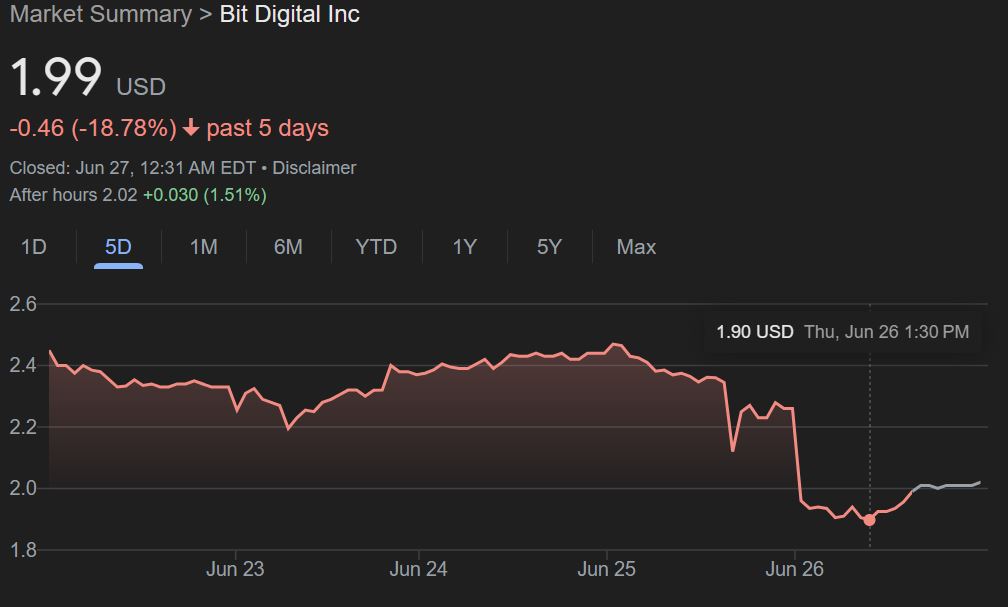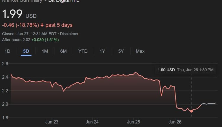 Former Bitcoin mining firm Bit Digital fell sharply this week, with its share price tumbling nearly 19% in a five-day period to close at $1.99 on June 27, a 15% drop in just 24 hours.