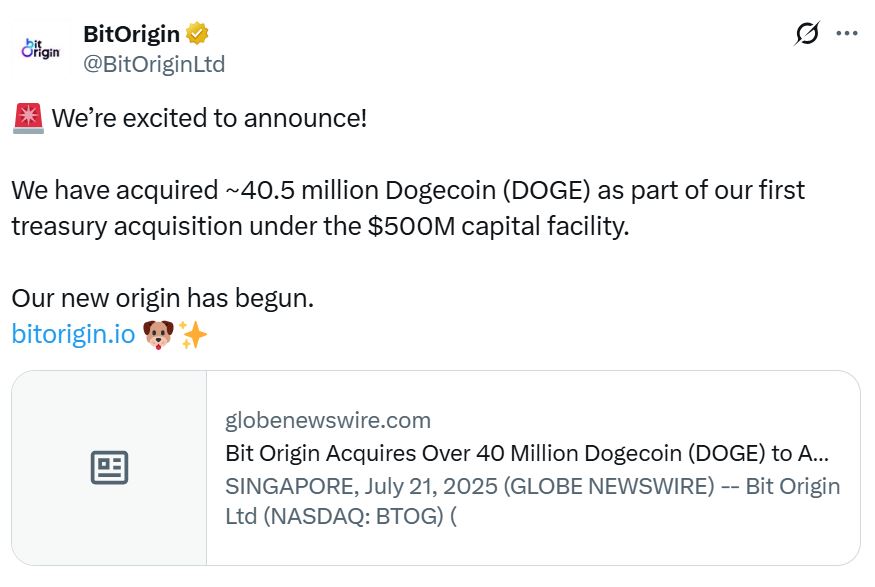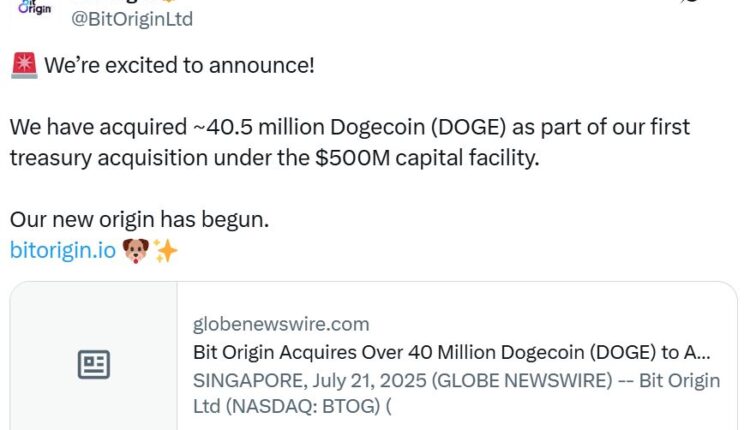 China-based pork processing company and Bitcoin miner Bit Origin has officially kicked off its crypto treasury initiative with its first acquisition of 40.5 million Dogecoin.