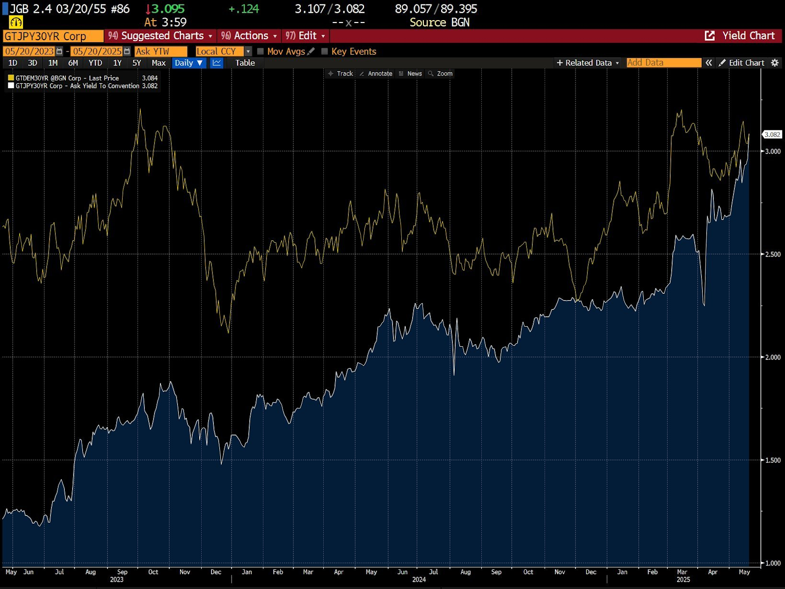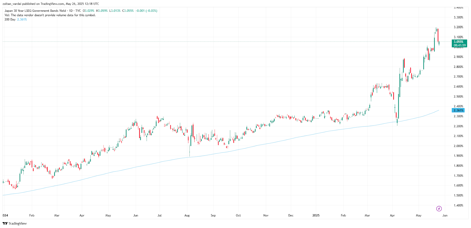 The 30-year yield on Japanese bonds reached a new all-time high of 3.185% on May 20, 2025, before retreating to 3.115% on May 23, TradingView data shows.