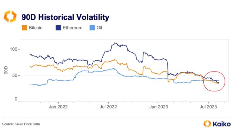 According to data shared by crypto analytic firm Kaiko, the 90-day volatility of BTC and ETH hit 35% and 37% respectively making it less volatile than oil with volatility of 41%. Such a decline in the price momentum of the top two crypto assets was last seen in 2016.