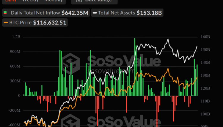 On Friday, spot Bitcoin (BTC) ETFs recorded $642.35 million in net inflows, marking the fifth straight day of gains, according to data from SoSoValue. This pushed cumulative net inflows to $56.83 billion, with total net assets now standing at $153.18 billion, roughly 6.62% of Bitcoin’s total market cap.