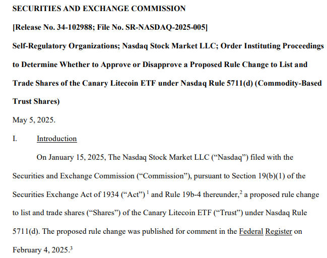The decision came the week after the SEC delayed its ruling on Canary Capital’s Litecoin (LTC) ETF, Bloomberg Intelligence analyst James Seyffart wrote in a May 5 X post.