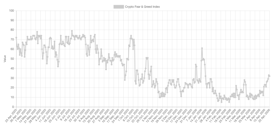 🚨 UPDATE: Crypto Fear & Greed Index sits at 32 (Fear) today, a notable recovery from Extreme Fear at 23 last week. pic.twitter.com/lmjfjh0Ui3— Cointelegraph (@Cointelegraph) April 22, 2026