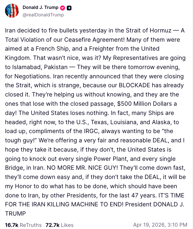 “My Representatives are going to Islamabad, Pakistan — They will be there tomorrow evening, for Negotiations,” he wrote in a post on Truth Social on Sunday.