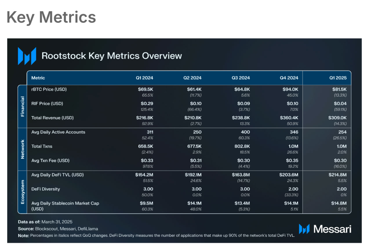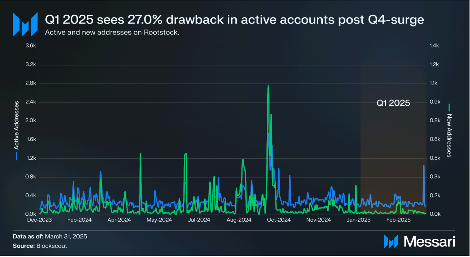 Smart contract platform Rootstock, the home of decentralized finance (DeFi) on Bitcoin, saw a sharp increase in network security and mining engagement in the first quarter of 2025, even as activity cooled.