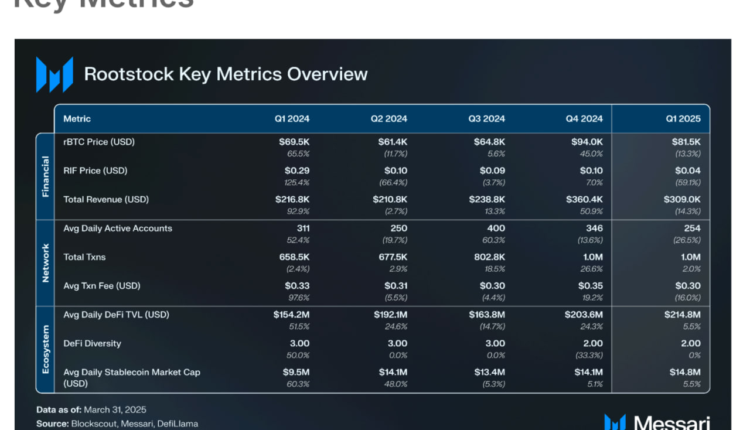 Smart contract platform Rootstock, the home of decentralized finance (DeFi) on Bitcoin, saw a sharp increase in network security and mining engagement in the first quarter of 2025, even as activity cooled.