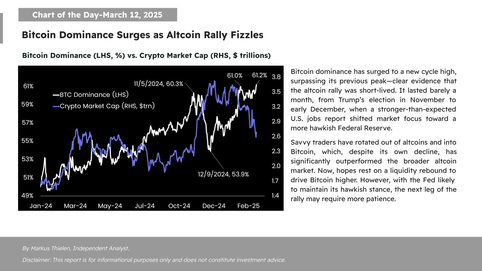 As of March 12, Bitcoin dominance — a measure of Bitcoin’s share of crypto’s overall market capitalization — stands at 61.2%, according to Matrixport. This is up from a cycle low of around 54% in December.