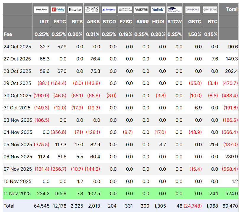 US spot Bitcoin ETFs saw $524 million worth of cumulative net inflows on Tuesday, marking the highest daily amount since Oct. 7, according to data from Farside Investors.