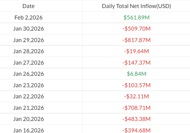 The fresh $562 million of inflows account for a notable portion of year-to-date outflows for spot Bitcoin ETFs, which stood at $1 billion as of Tuesday.