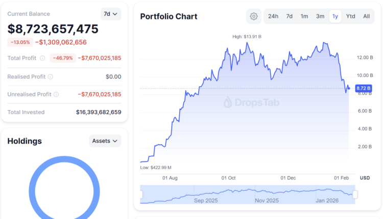 The company said Monday that the value of its crypto, total cash holdings and “moonshots” is $10.0 billion. It ended the November 2025 quarter with digital assets valued at $10.6 billion, according to a filing.