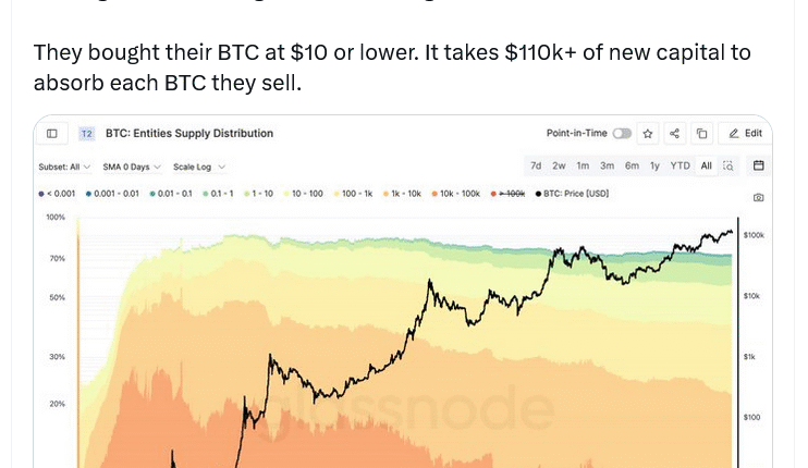 “BTC supply is concentrated around OG whales who peaked their holdings in 2011,” Woo said in an X post on Sunday. “They bought their BTC at $10 or lower.”