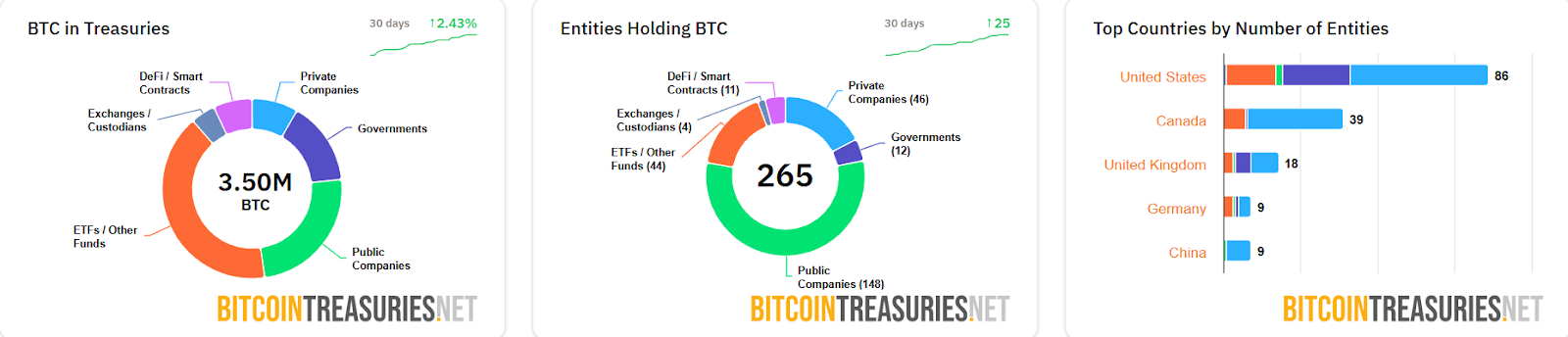 A total of 3.5 million Bitcoin is held in company treasuries, with 853,000 BTC, or 4% of the total supply, in public company treasuries, and over 1.4 million BTC, or 6.6% of the supply, through spot Bitcoin exchange-traded funds (ETFs).