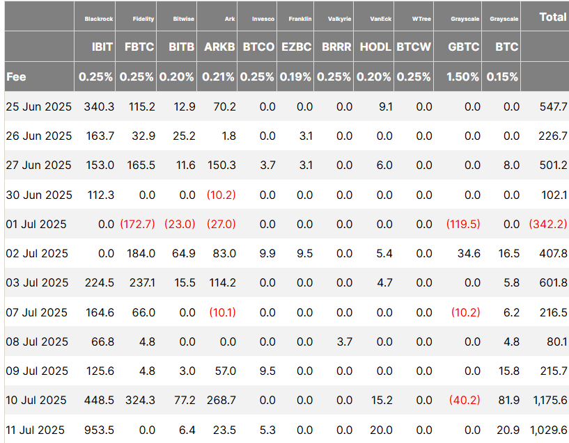 Spot Bitcoin ETFs amassed over $1 billion worth of net positive inflows on Friday, marking a seventh consecutive day of investments, Farside Investors data shows.