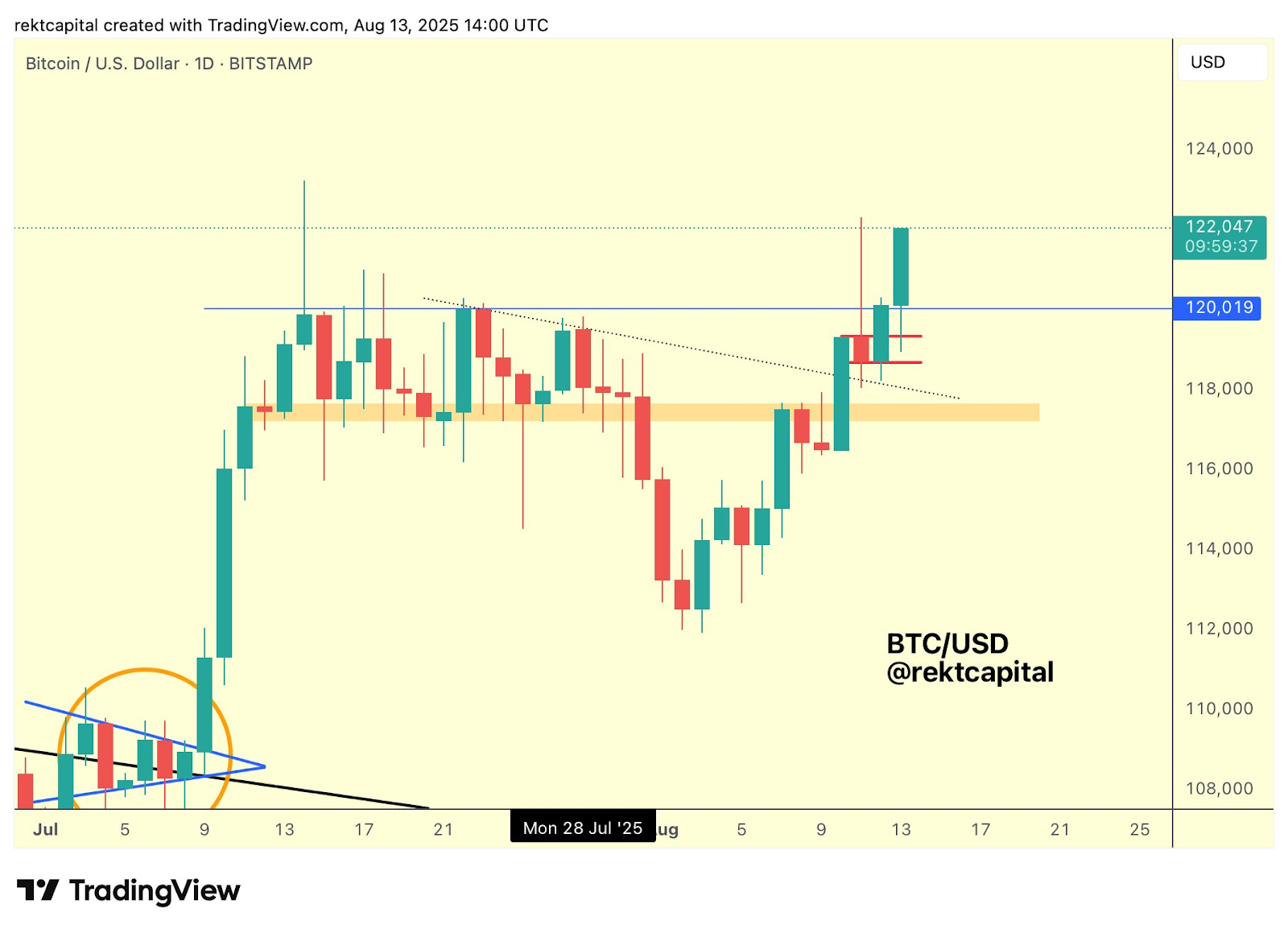 Meanwhile,$126,000 is emerging as the next “pivotal” price level to confirm another breakout, after Bitcoin flipped the $120,000 psychological mark into a significant support, wrote analyst Rekt Capital, in a Wednesday X post.