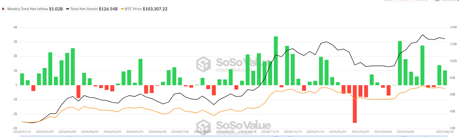 US spot Bitcoin exchange-traded funds (ETFs) continued accumulating despite the geopolitical concerns, amassing over $1 billion worth of cumulative net inflows over the past week, Sosovalue data shows.