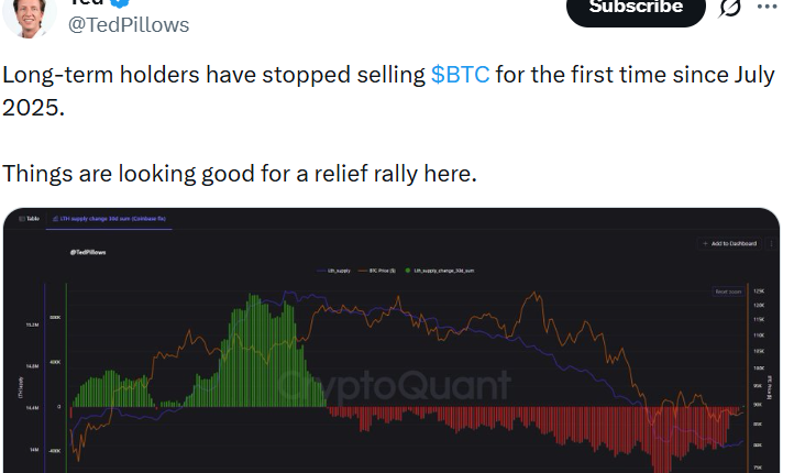 “Long-term holders have stopped selling Bitcoin for the first time since July 2025. Things are looking good for a relief rally here,” he said.