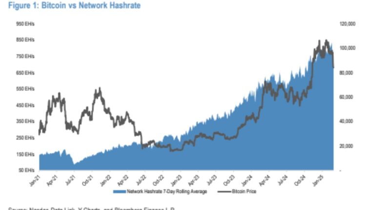 Bitcoin’s price versus the network’s hashrate. Source: JPMorgan