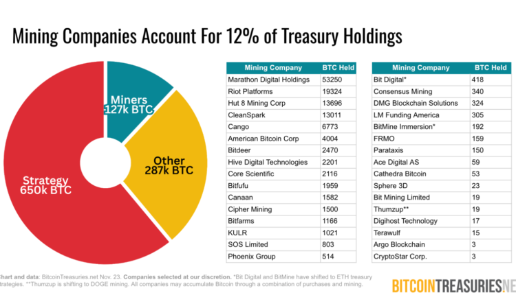 Bitcoin miners, which can acquire the cryptocurrency at below-market costs, could be in the best position to shape corporate adoption as accumulation by crypto treasury companies slows, says BitcoinTreasuries.NET.