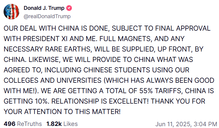“Our deal with China is done, subject to final approval with President Xi and me,” Trump said. “We are getting a total of 55% tariffs, China is getting 10%. Relationship is excellent.”