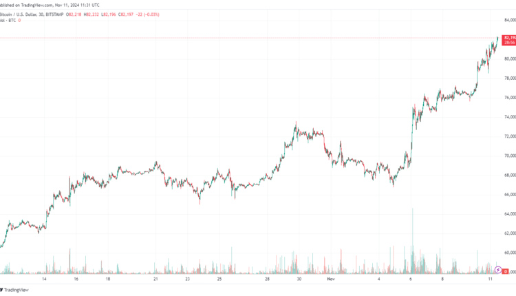 The Bitcoin (BTC) price broke above a new high of $82,410 at 10:19 am UTC on Nov. 11, Bitstamp data shows.