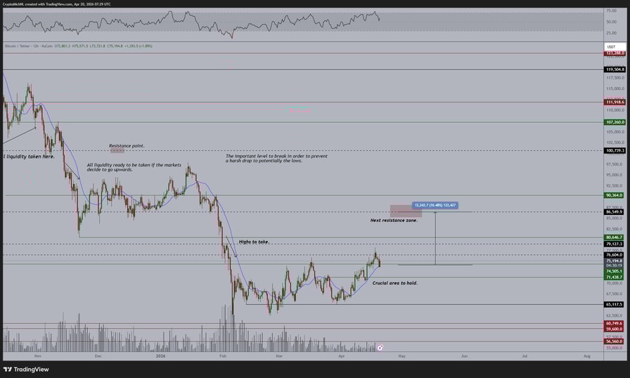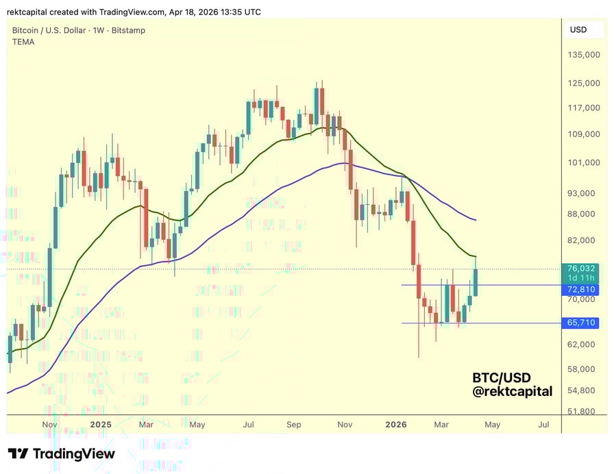 A successful retest of the Double Bottom formation would confirm the breakout$BTC #Crypto #Bitcoin https://t.co/7eZiVYZFeQ pic.twitter.com/cWxH3lMNpb— Rekt Capital (@rektcapital) April 19, 2026