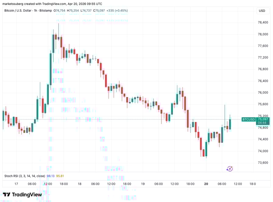 Bitcoin still managed a “green” weekly candle despite last-minute sellers driving price below $74,000.