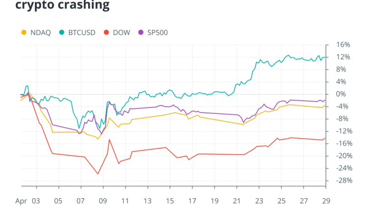On April 2, Trump levied “discounted reciprocal tariffs” on 185 countries and territories. The Dow Jones Industrial Average dropped 2,200 points on April 4, while the S&P 500 dropped nearly 6%, its largest decline since March 2020. Bitcoin (BTC) went along for the ride but broke from stocks as it recovered toward the end of the month.