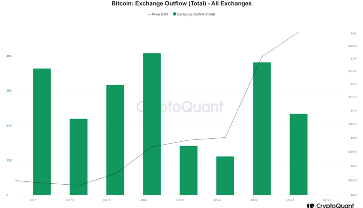 Major crypto exchanges recorded a net outflow on Oct. 24 as Bitcoin price briefly touched the $35,000 mark for the first time in a year. The movement of funds away from exchanges is considered a bullish sign as traders move their assets away from the centralized platforms in anticipation of a price surge.
