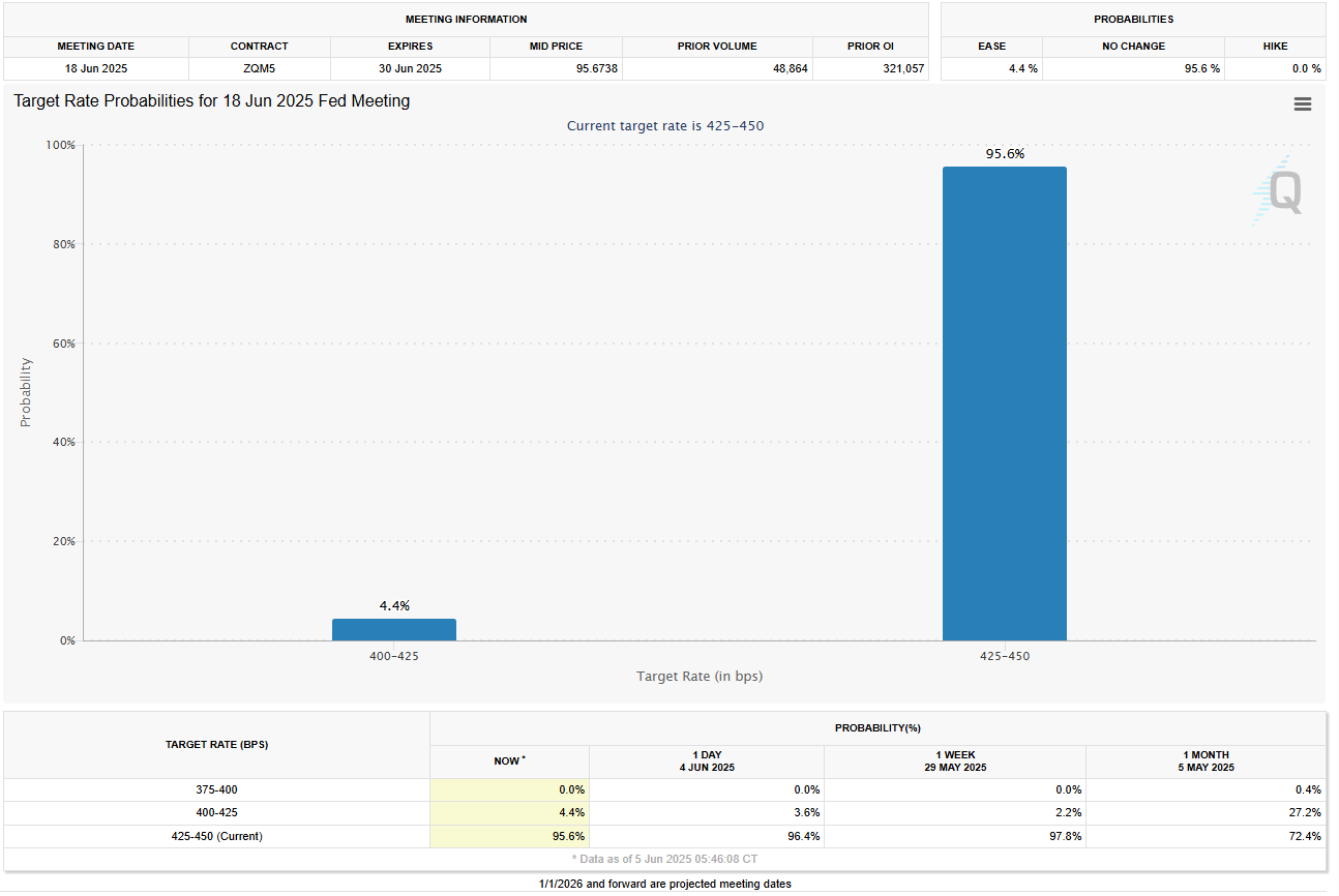 Markets are currently pricing in a 95% chance that the Fed will keep interest rates steady during the next Federal Open Market Committee (FOMC) meeting on June 18, according to the latest estimates of the CME Group’s FedWatch tool.